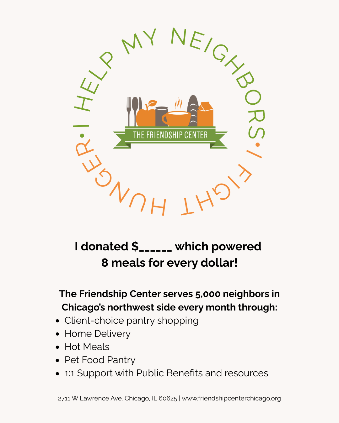 You are welcome to stop by and make a donation in person or send a check by mail. Please address donations to: The Friendship Center 2711 W Lawrence Ave. Chicago, IL 60625